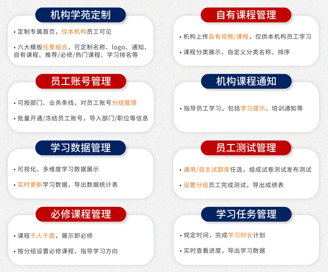 為輔助HR提高管理效率,資管云4.0推出機構(gòu)學苑版本,升級機構(gòu)專區(qū)功能,打造機構(gòu)專屬定制化培訓平臺。
