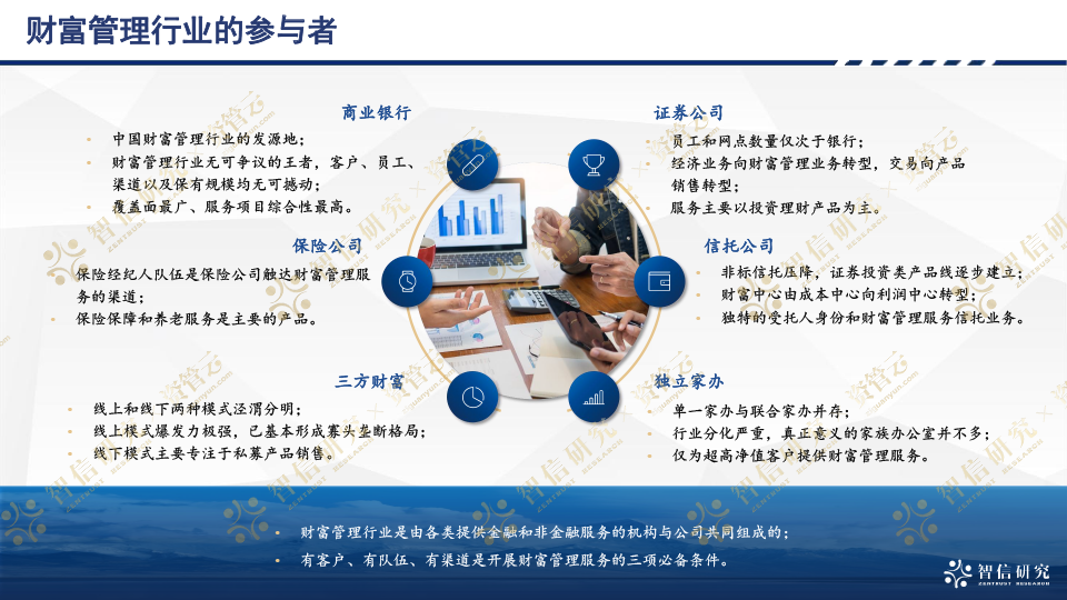 那么,銀行、信托、保險、三方財富,都在說要做財富管理,大家干的是一回事兒嗎?行業(yè)格局如何,各類機(jī)構(gòu)的模式又有何差異?