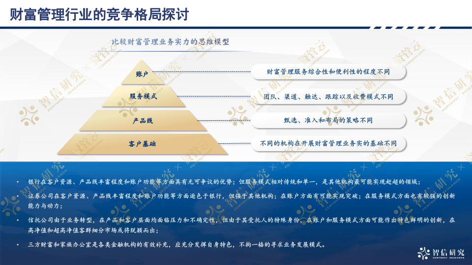 本次分享嘉賓為智信研究公司財富管理首席研究員孫陽。在分享過程中,孫陽老師提出了一種比較各類機(jī)構(gòu)財富管理業(yè)務(wù)能力的思維模型。