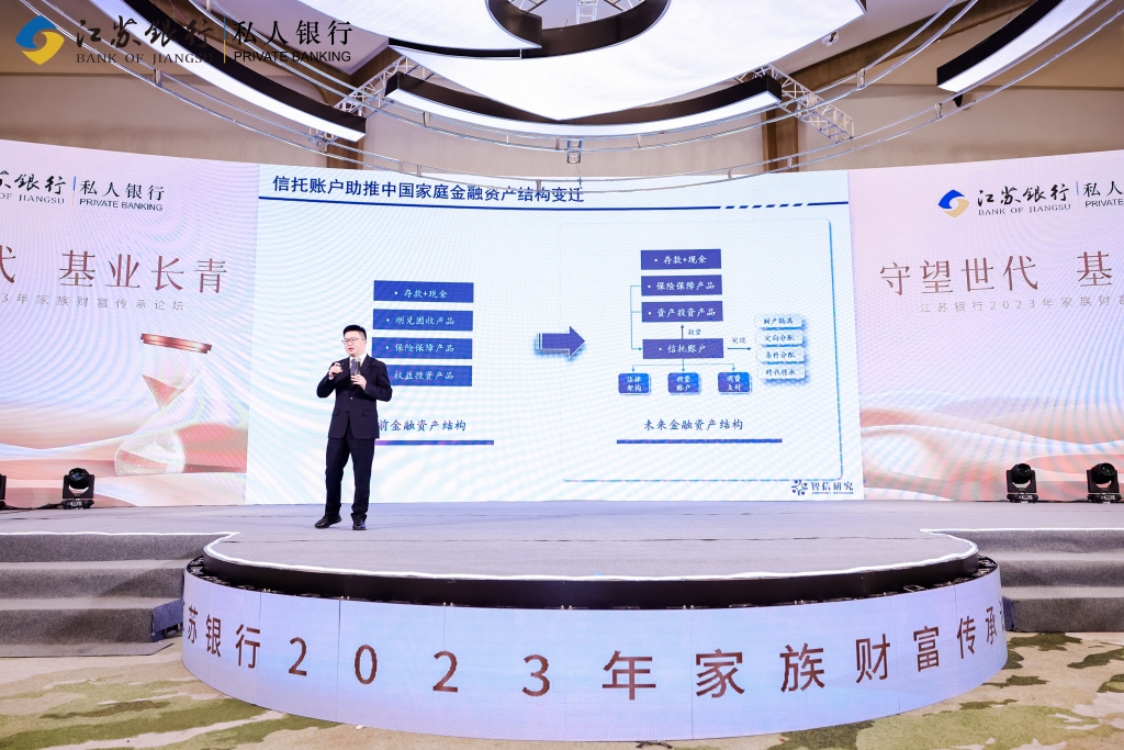 2023年11月16日,智信研究公司總經(jīng)理鄭智受邀參加“江蘇銀行2023年家族財富傳承論壇”,并發(fā)表題為《信托制度普惠化與財富管理新生態(tài)》的主題演講。鄭智表示新生態(tài)要以客戶為中心,打通制度工具,打通產(chǎn)品貨架,共同為客戶提供更好的服務(wù)。